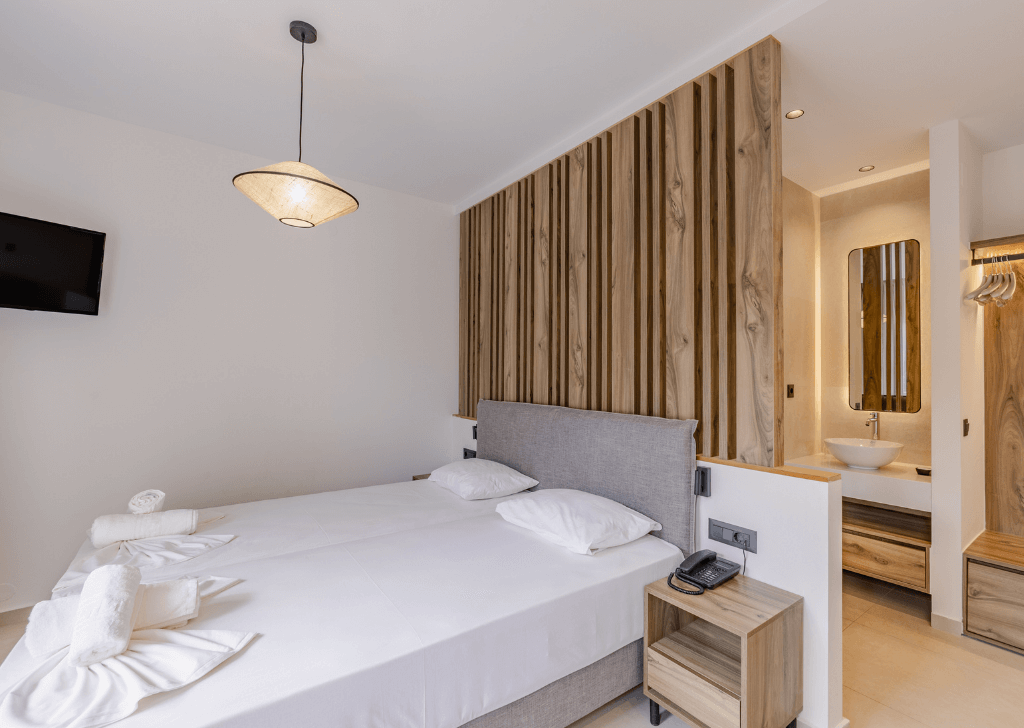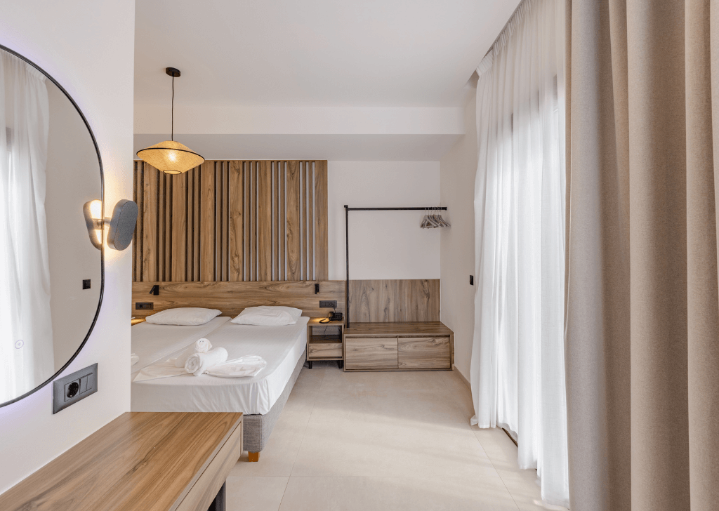 Τα δωμάτια ανακαινίστηκαν με έμφαση στη λειτουργικότητα και την εργονομία. Η υλικότητα βασίστηκε κυρίως στο ξύλο, το οποίο χρησιμοποιήθηκε σε ντουλάπες, επενδύσεις και έπιπλα, δημιουργώντας αίσθηση ζεστασιάς και ηρεμίας.