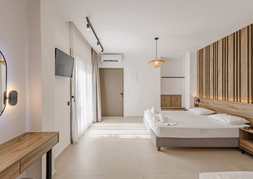 Στο Ροδάκινο, ένα τοπίο αυθεντικής κρητικής ομορφιάς, μας ζητήθηκε να ανανεώσουμε τμήμα του ξενοδοχειακού συγκροτήματος Πολύριζος, επικεντρώνοντας την αρχιτεκτονική μελέτη στην ανακαίνιση επιλεγμένων δωματίων και των όψεων. Στόχος ήταν να αναβαθμίσουμε την εμπειρία διαμονής, να ενισχύσουμε την εμπορική απόδοση του καταλύματος και να φέρουμε τη λειτουργικότητα και την αισθητική στα σύγχρονα πρότυπα φιλοξενίας.